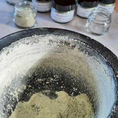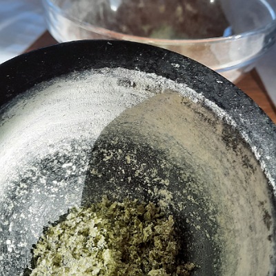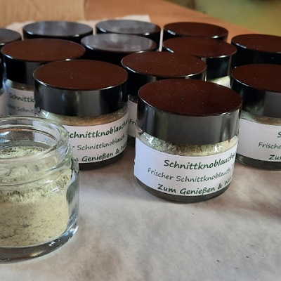Da bot die Gartentherapie – auch wenn ich nicht unbedingt das habe, was man einen „grünen Daumen“ nennt, Gelegenheit die Maske abzulegen und im hauseigenen Garten Hand anzulegen. Bei einem dieser Therapieeinheiten kümmerte ich mich um das Mörsern von getrocknetem Schnittknoblauchsalz. Ganz schön anstrengend, wenn man zudem bedenkt, wie viel Zeit und Energie man auf das Drehen des Stößels im Mörser anwenden musste und wie wenig feines Salz bei einem Durchgang klein gemörsert wurde.
